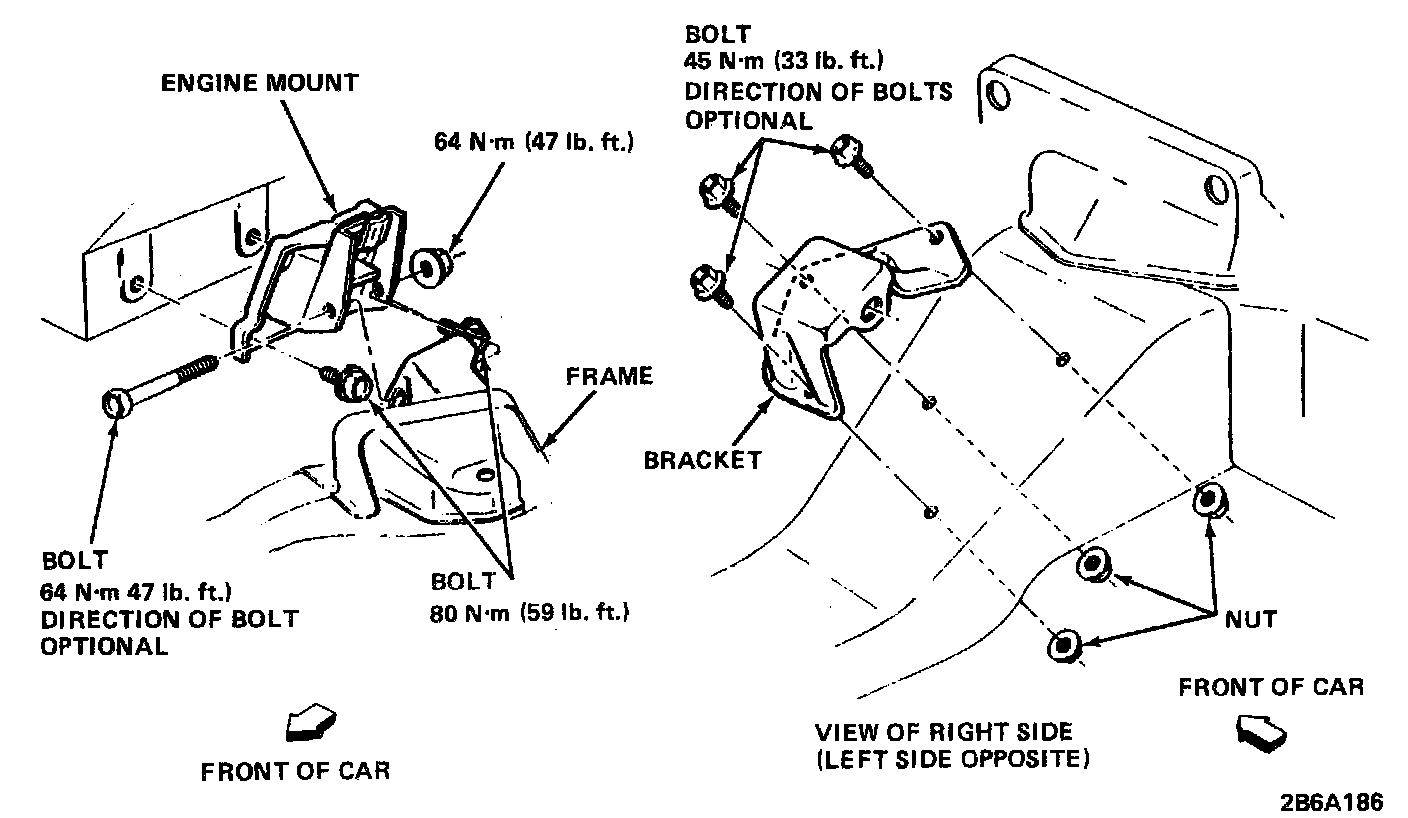 2. It may be necessary to alternately raise and lower transmission to fit motor mount through-bolts into position. Install through-bolt and nut and torque nut to 48 N.m (35 ft. lbs.).