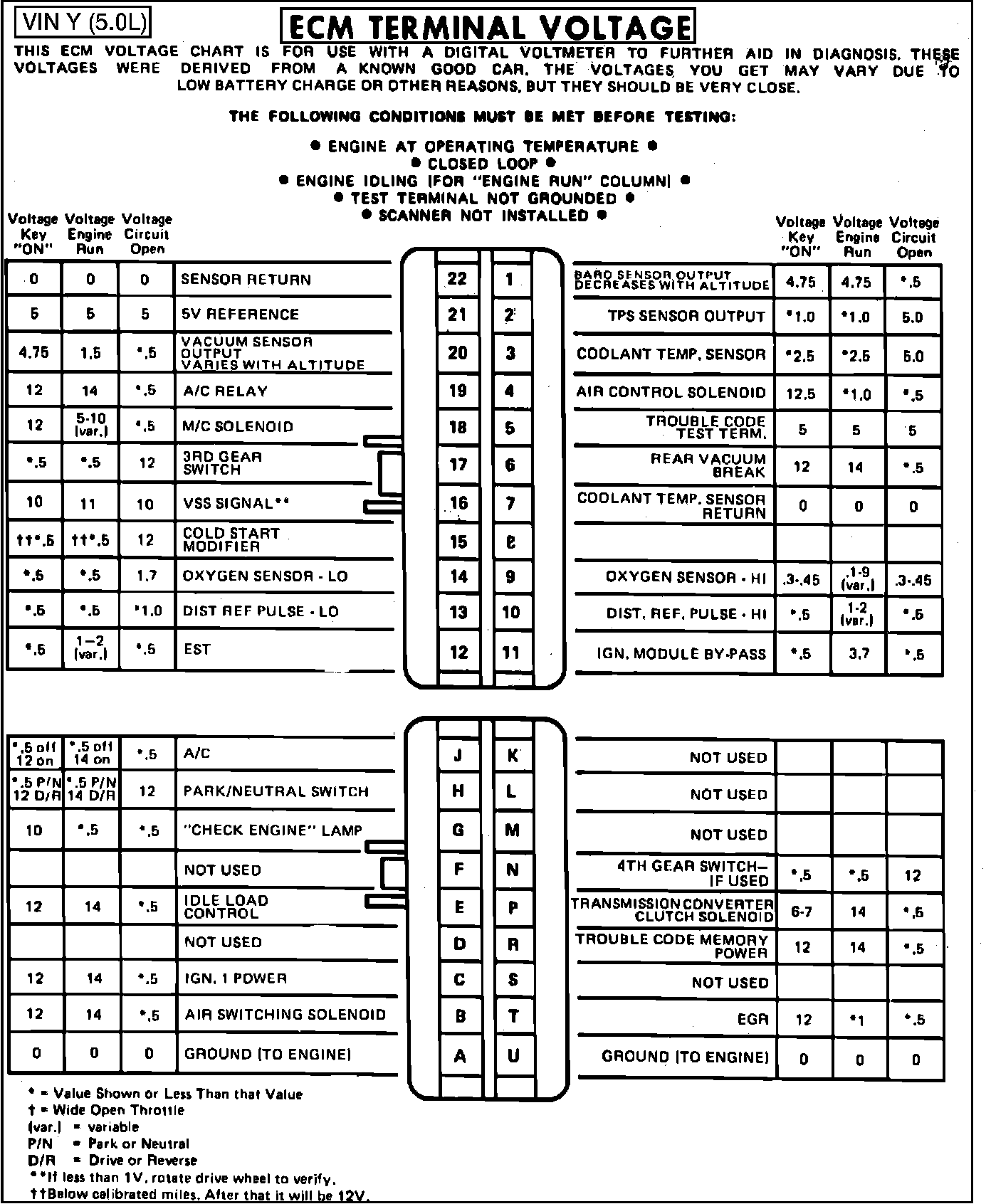 Fig. 035 - ECM Connector Terminal Identification & Voltage Specifications.: