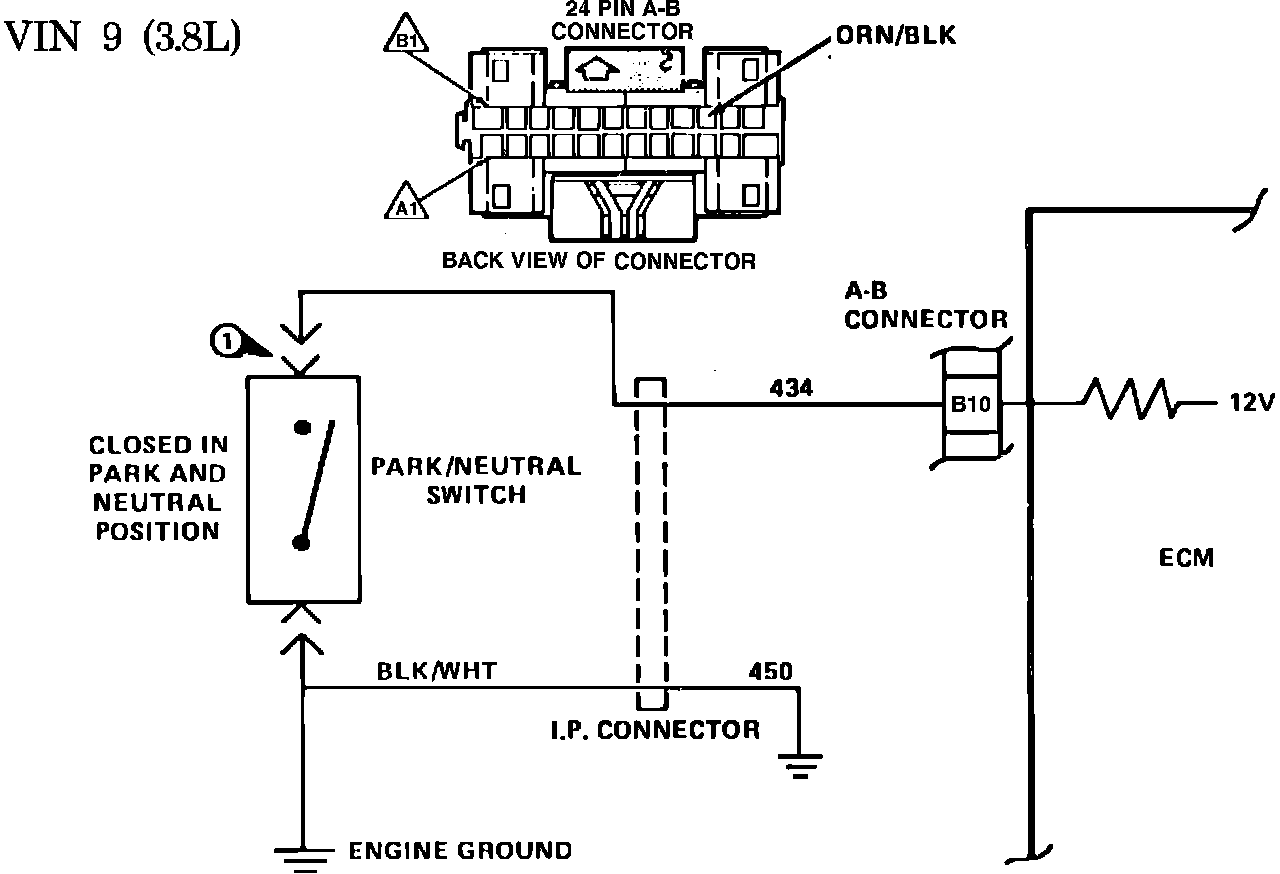 The Park/Neutral Switch is closed to ground in Park or Neutral and open in other ranges. The ECM supplies 12 volts through an internal resistor to CKT 434 and senses that the switch, is closed when the voltage at terminal B-10 drops to less than 1 volt.