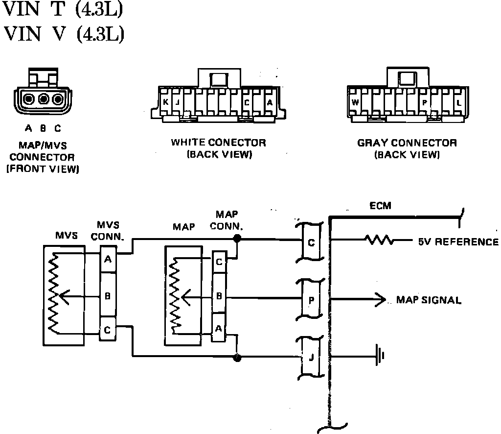 1. Checks for V-ref. at MAP sensor harness. Normal voltage at Terminal "C" of MAP harness should be about 5 volts.