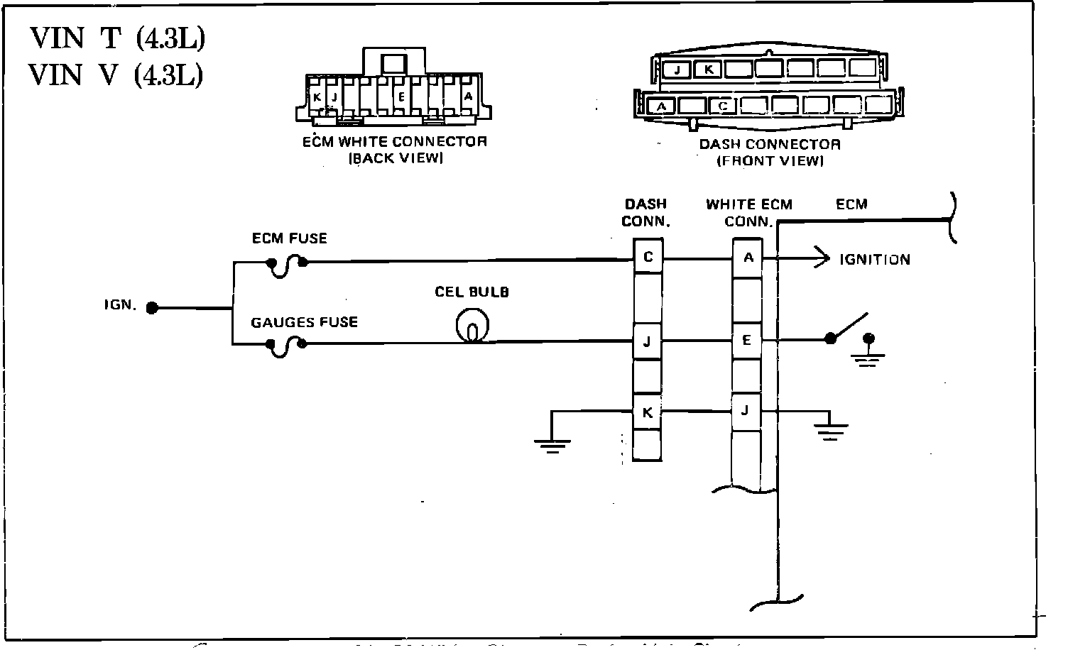 3. Checks for a good ECM ground. If there is a poor connection to ground, voltage at Terminal "K" will be above 1 volt. The poorer the ground, the higher the voltage.