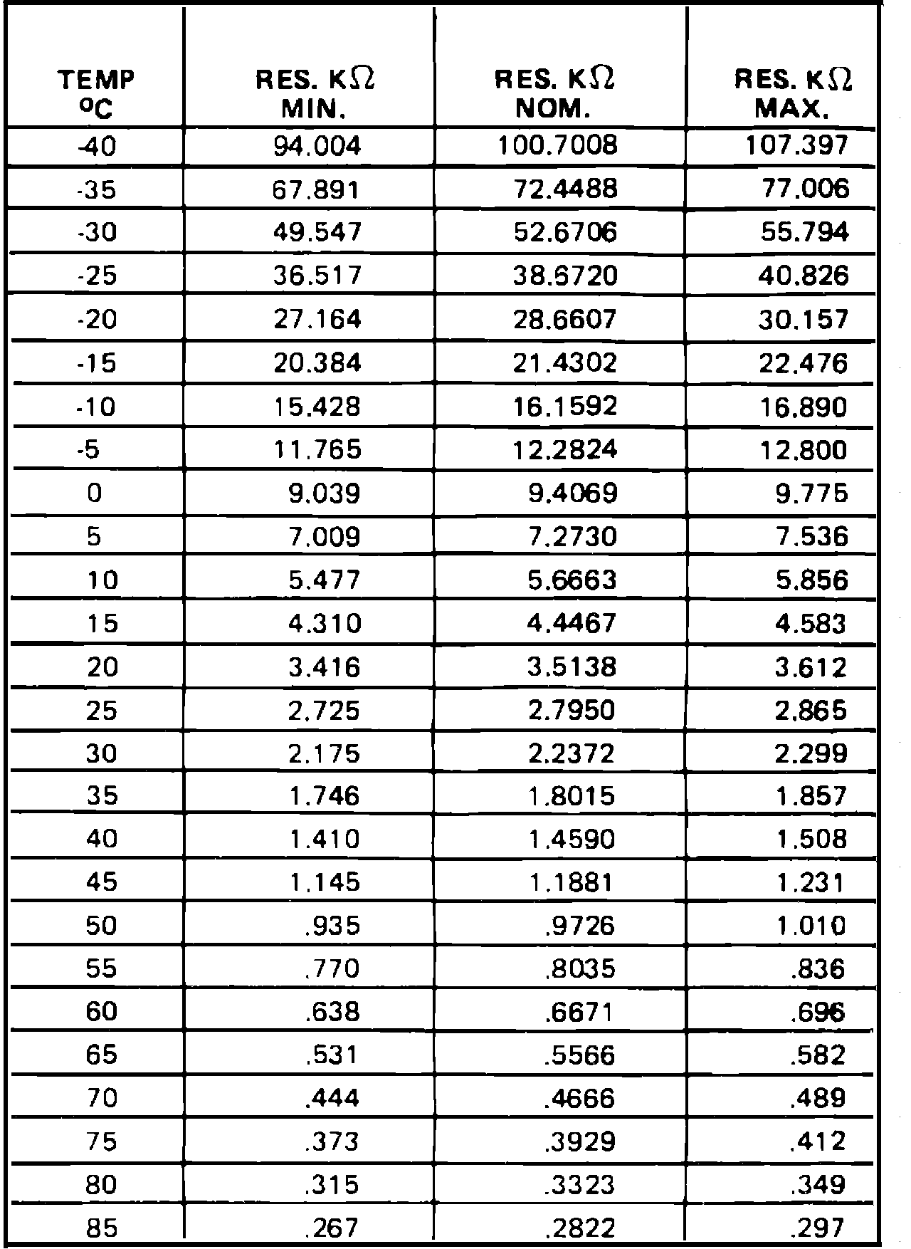 Sensor Resistance Chart