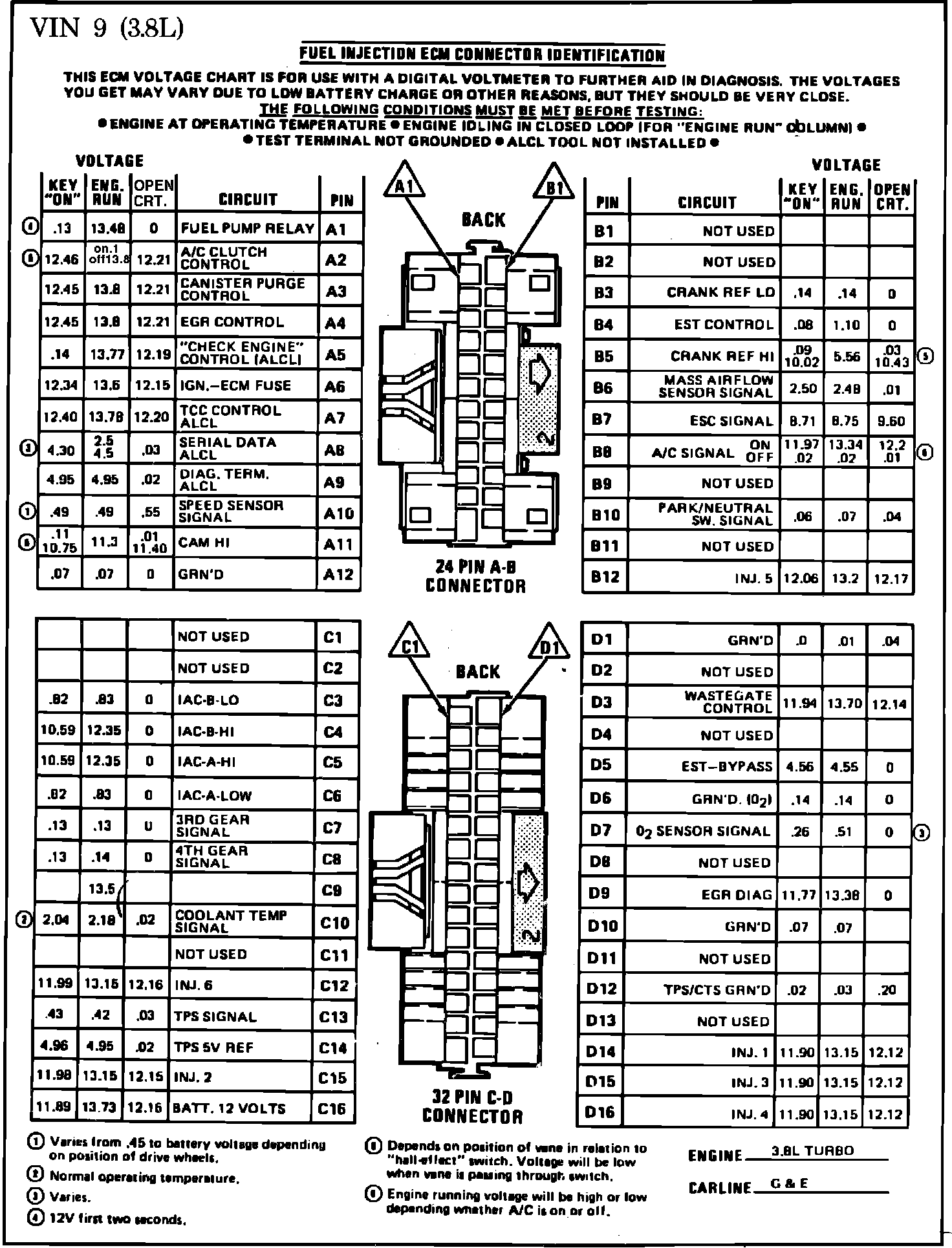 Fig. 020 ECM Connector Terminal Identification & Voltage Specifications: