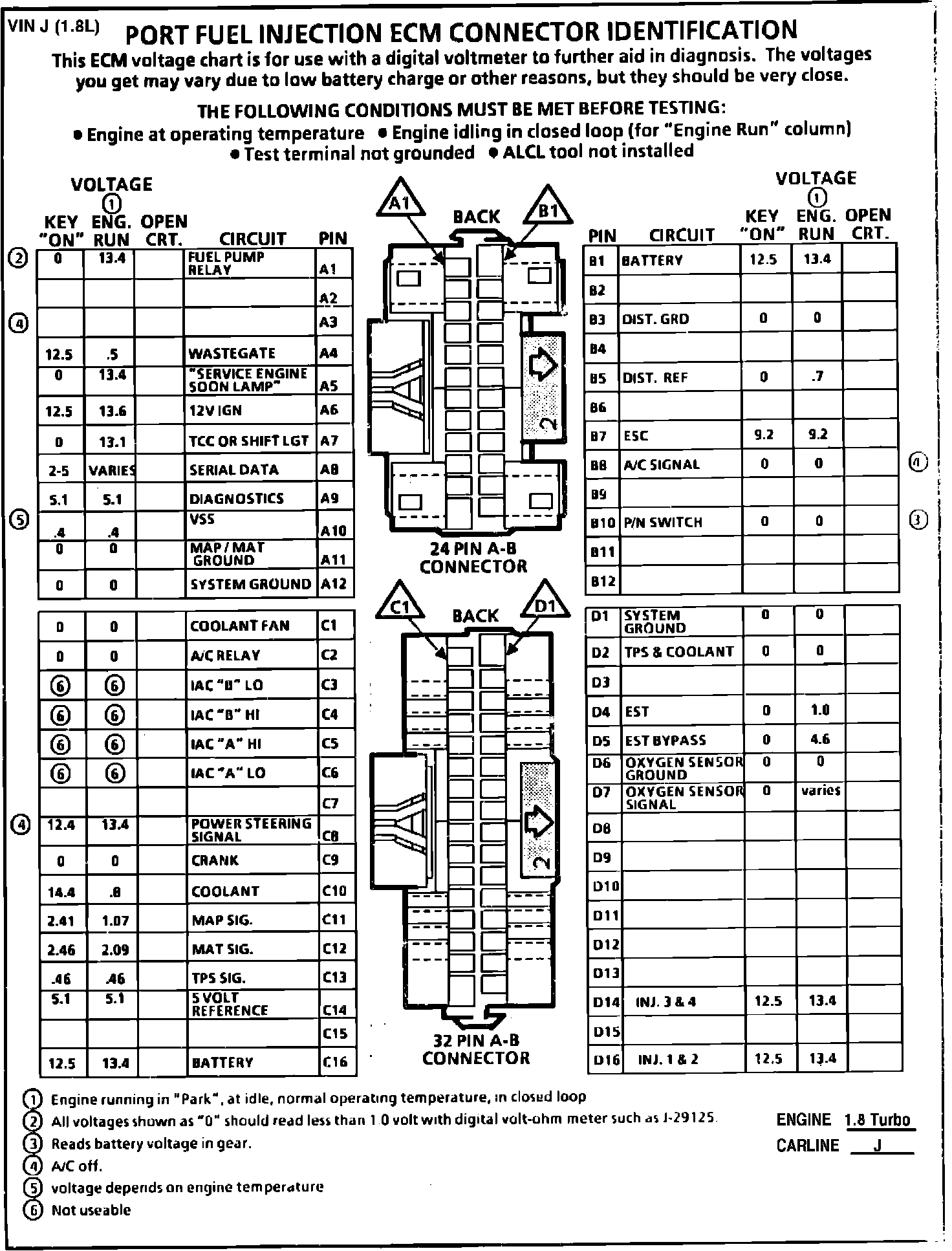 Fig. 027 ECM Connector Terminal Identification & Voltage Specifications: