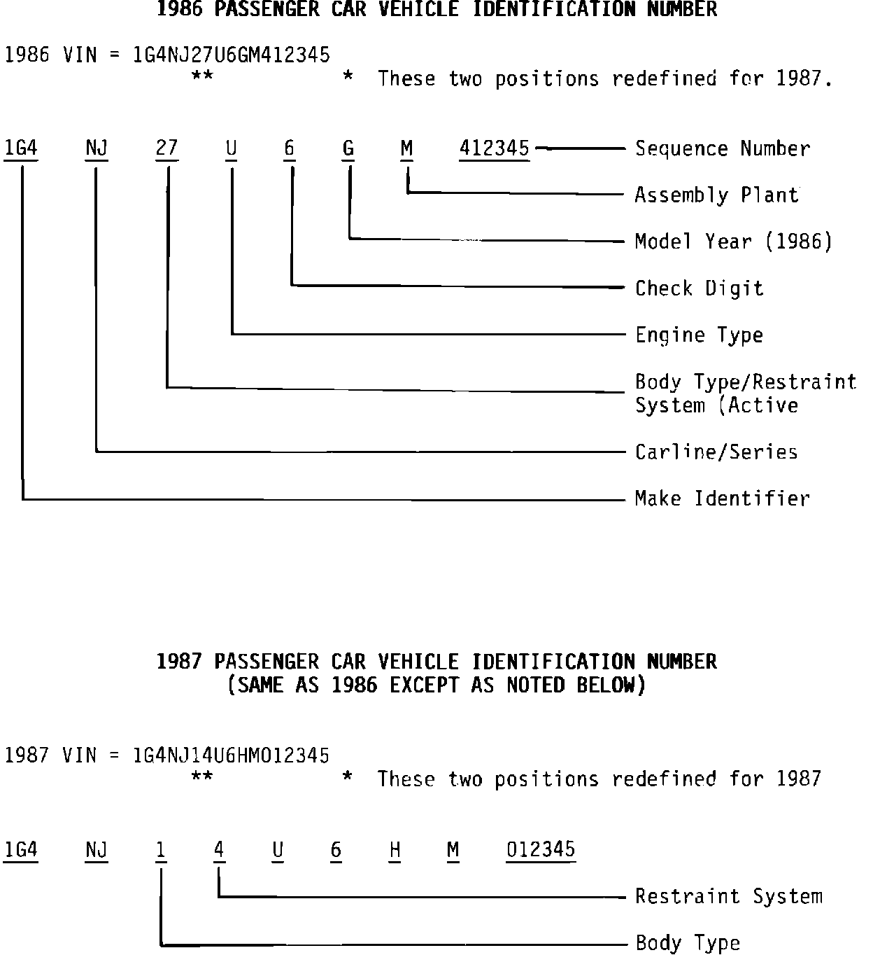 Effective with the 1987 model year, the GM Vehicle Identification Number (VIN) format will be modified for all Buick carlines. The changes will be made to VIN position #6 and #7 which displayed the passenger car body style in 1986.