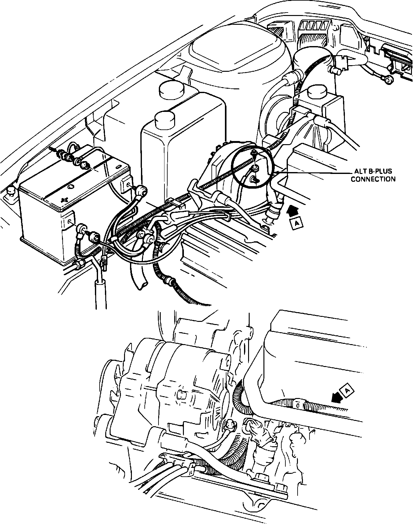 This condition can be corrected by removing the branch from the underside of the "B-plus" (BAT Terminal) connection, repairing as necessary, and routing it above the "B-plus" (BAT Teminal).