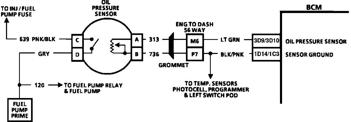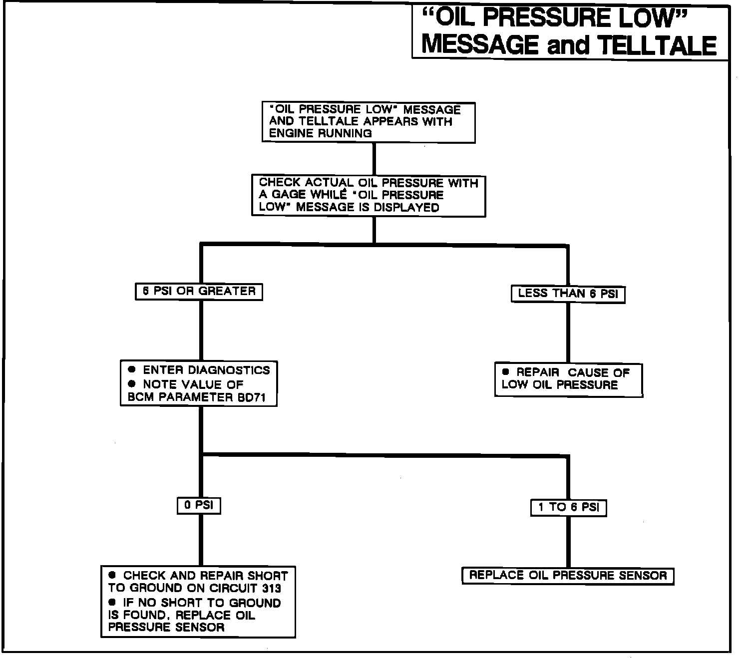 The BCM provides voltage to the oil pressure circuit, and the oil pressure sensor provides the single path to ground. The BCM supplies and internally monitors the voltage level of the circuit at pin 3D9. The sensor acts like a variable resistor, when the oil pressure is high, resistance is high, and the BCM will detects high voltage. As the oil pressure decreases so will the voltage level sensed by the BCM at pin 3D9. The BCM will then calculate the oil pressure by the amount of voltage present, and when the calculated oil pressure drops below 6.0 psi, and all other failure conditions have been met, the BCM will send the "LOW OIL PRESSURE" message to the CRT. The BCM will also illuminate the "OIL PRESSURE" telltale on the IPC.