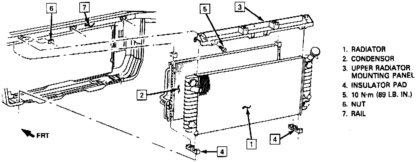 5. Upper radiator mounting panel bolts and clamps.