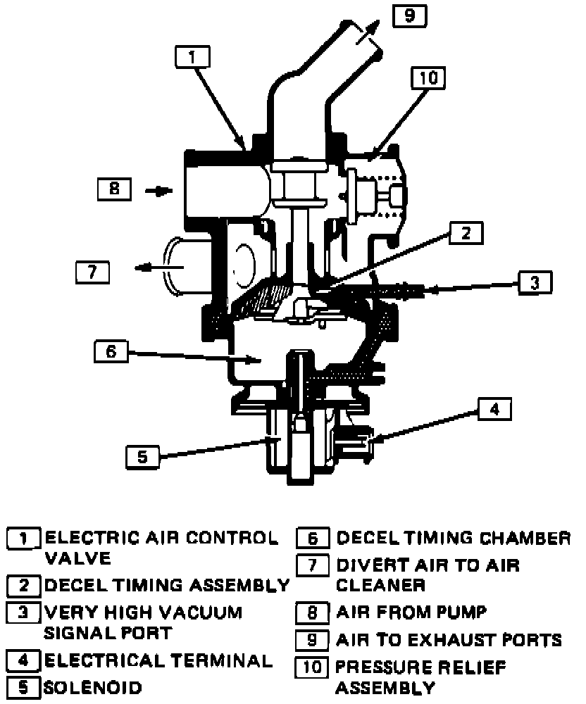 The EAC valve combines an electronic controlled valve with normal (vacuum controlled) diverter valve function. When the solenoid is energized, the air control (divert) valve performs as a standard diverter valve. The A.I.R. pump directs air to the exhaust ports, unless there is a sudden rise in manifold vacuum due to vehicle deceleration.