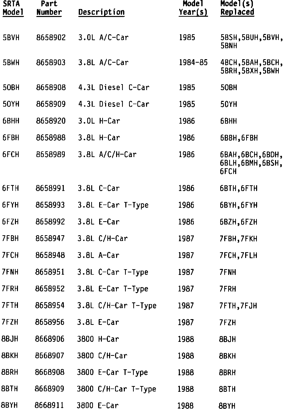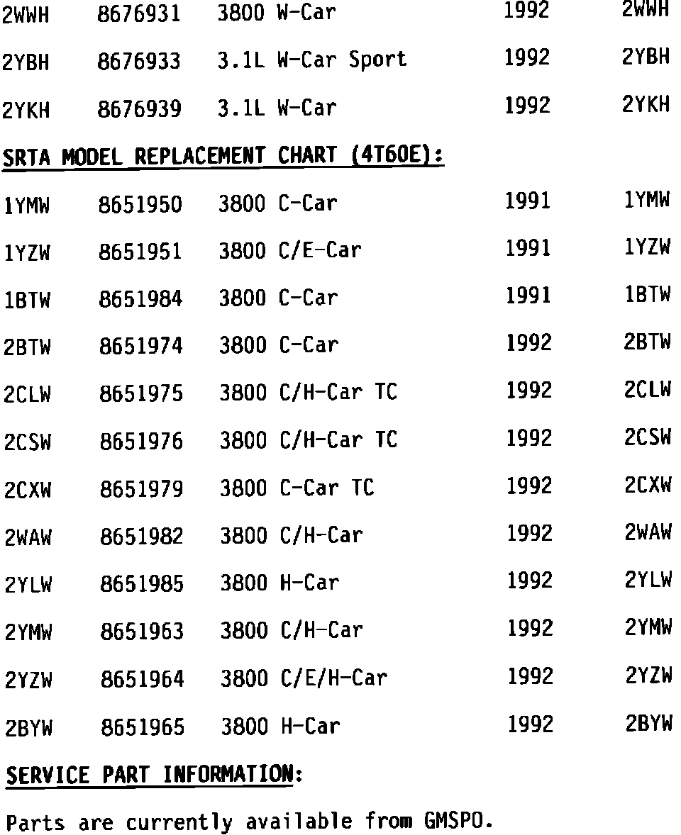 This bulletin expands the list of available SRTA part numbers and covers broad usage. The SRTA chart provides a complete list of the 1984 through 1992 models available through GMSPO. If questions arise concerning model application, consult the GMSPO catalog for the latest, most specific usage.