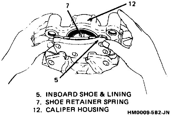 1. Install inboard shoe and lining by snapping retainer spring into piston ID., shoe must lay flat against piston.