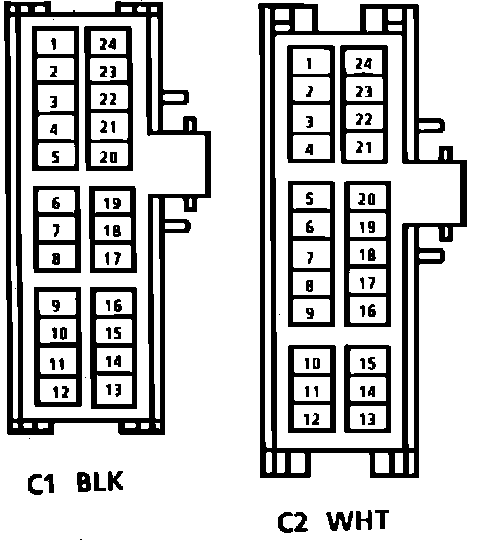 1. With ignition off, disconnect ECM connectors C1 and C2, Fig. 2, then turn ignition switch to Run position, place cruise control in Off position and measure voltage between terminal C2/20 (gray wire, except Beretta and Corsica) or C1/20 (gray wire, Beretta and Corsica) and ground.