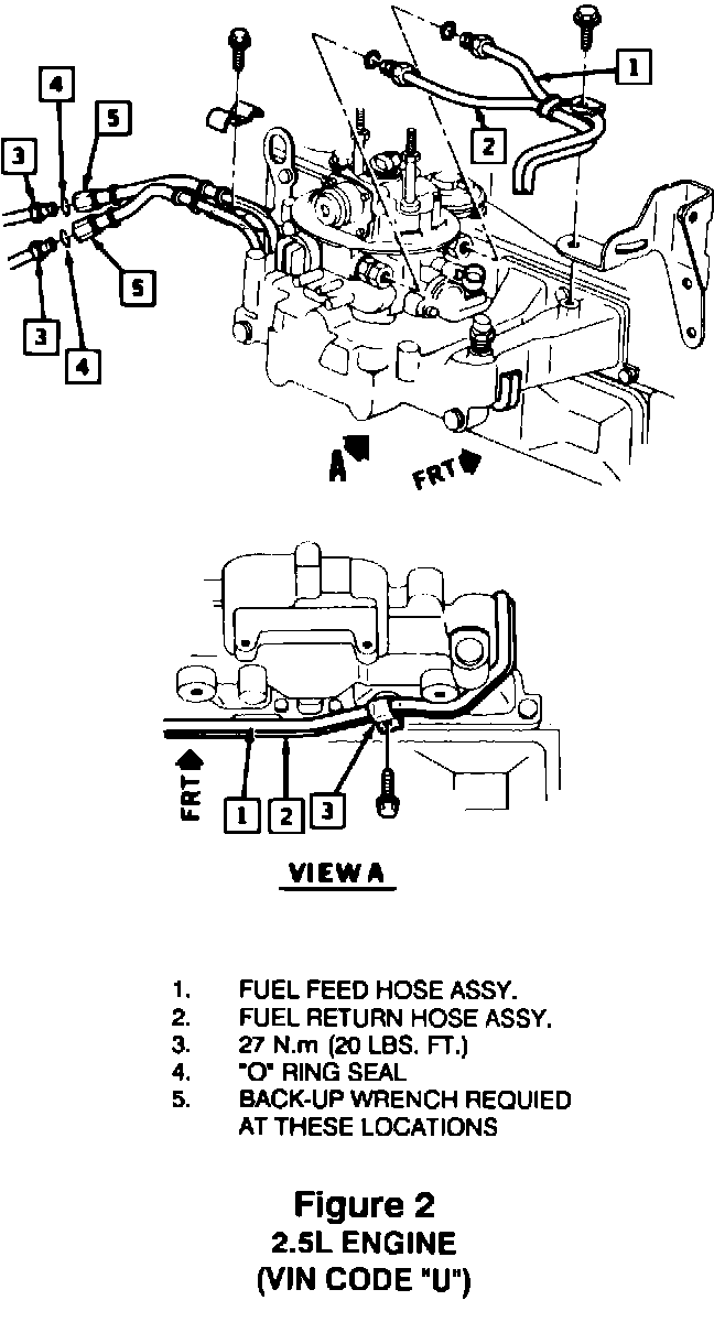 For 2.5L engines (VIN Code "U"), see Figure (2); the fittings to be torqued are labelled "3" and "5" in Figure 2.