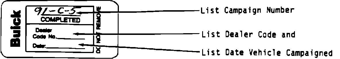 Each vehicle corrected in accordance with the instructions outlined in this Product Campaign Bulletin will require a "Campaign Identification Label." Each label provides a space to include the five (5) digit dealer code of the dealer performing the campaign service. This information may be inserted with a typewriter or a ball point pen.