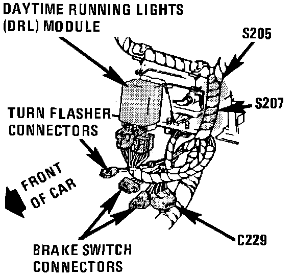 The Daytime Running Light Module is located behind center of I/P, near turn flasher.
