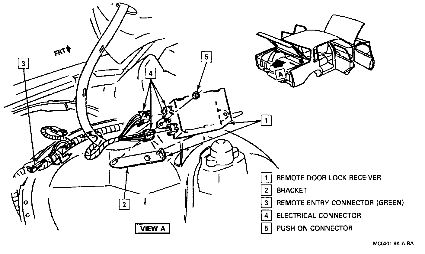 1. Access to the remote entry connector (green connector) is made by moving the carpeting at the driver's side rear wheelhouse, see image view A.