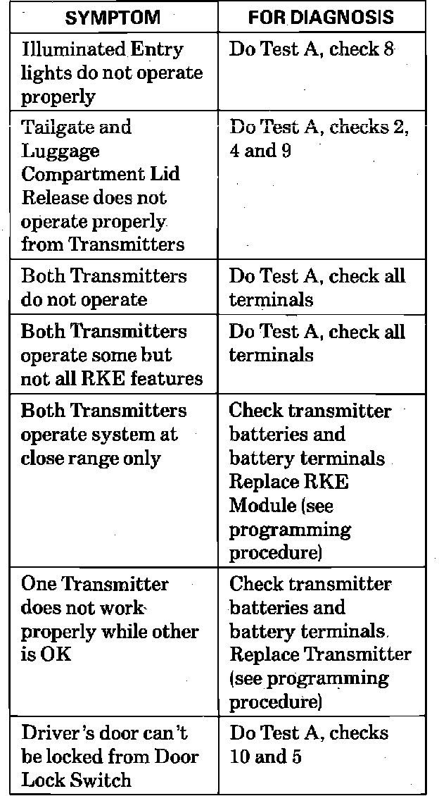 Remote Keyless Entry Symptom Chart: