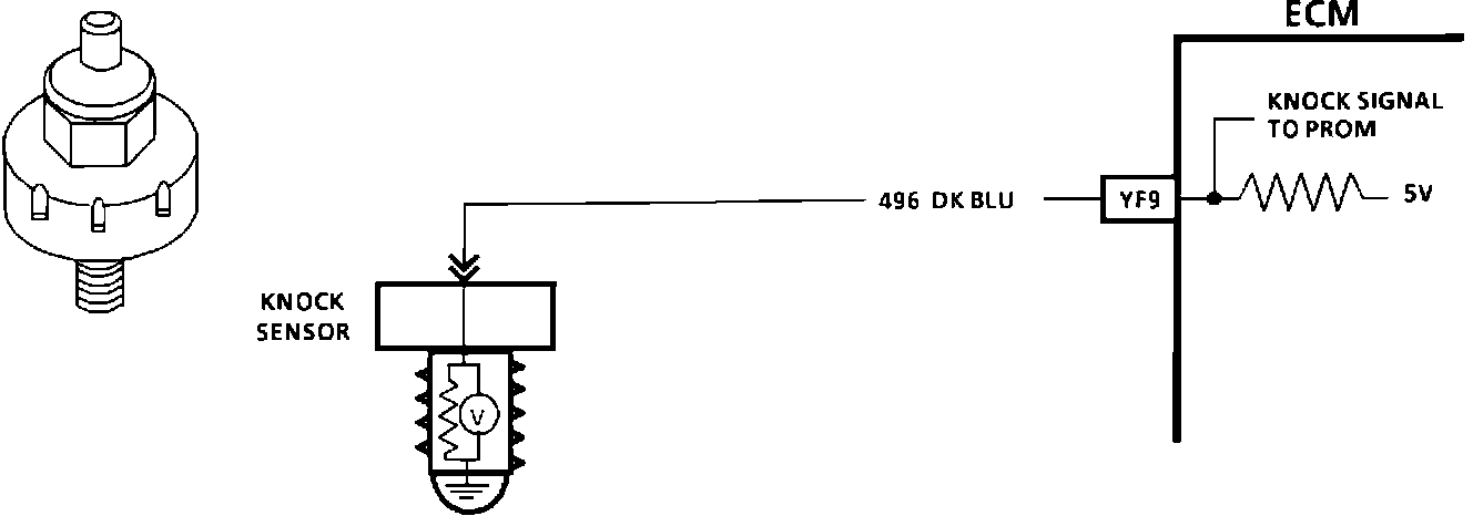 The knock Sensor (KS) is used to detect engine detonation and the ECM will retard the ignition control timing based on the signal being received. The circuitry, within the knock sensor, causes the ECMs 5 volts to he pulled down so that under a no knock condition, CKT 496 would measure about 2.5 volts. The knock sensor produces an AC signal, which rides on the 2.5 volts DC voltage. The amplitude and frequency are dependent upon the knock level.