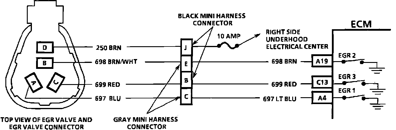 The digital EGR valve is designed to accurately supply exhaust gas to the engine without the use of manifold vacuum. The valve controls EGR flow from the exhaust to the intake manifold through three orifices, which increment in size to produce seven combinations. When the solenoid is energized, the armature, combined with an attached shaft and swivel pintle, is raised and the orifice is opened.