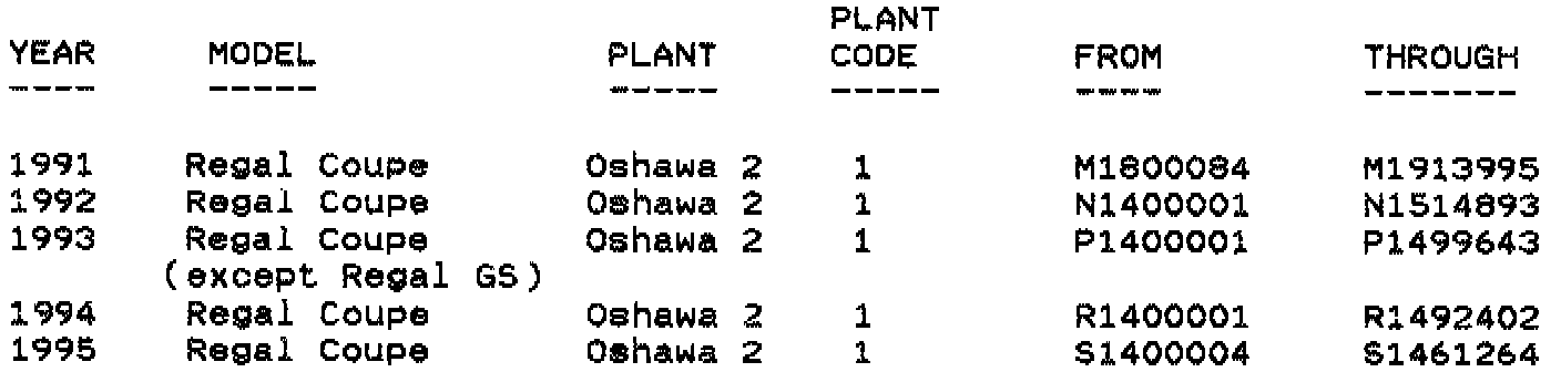 Involved are ALL 1991-95 Buick Regal Coupe vehicle models (except 1993 Regal GS Coupe) built within the VIN breakpoints as shown.