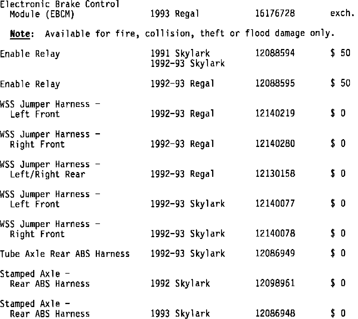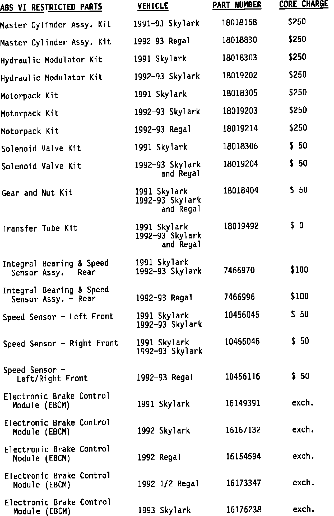 SERVICE PARTS EXCHANGE PROGRAM FOR DELCO CHASSIS ABS VI BRAKE SYSTEM