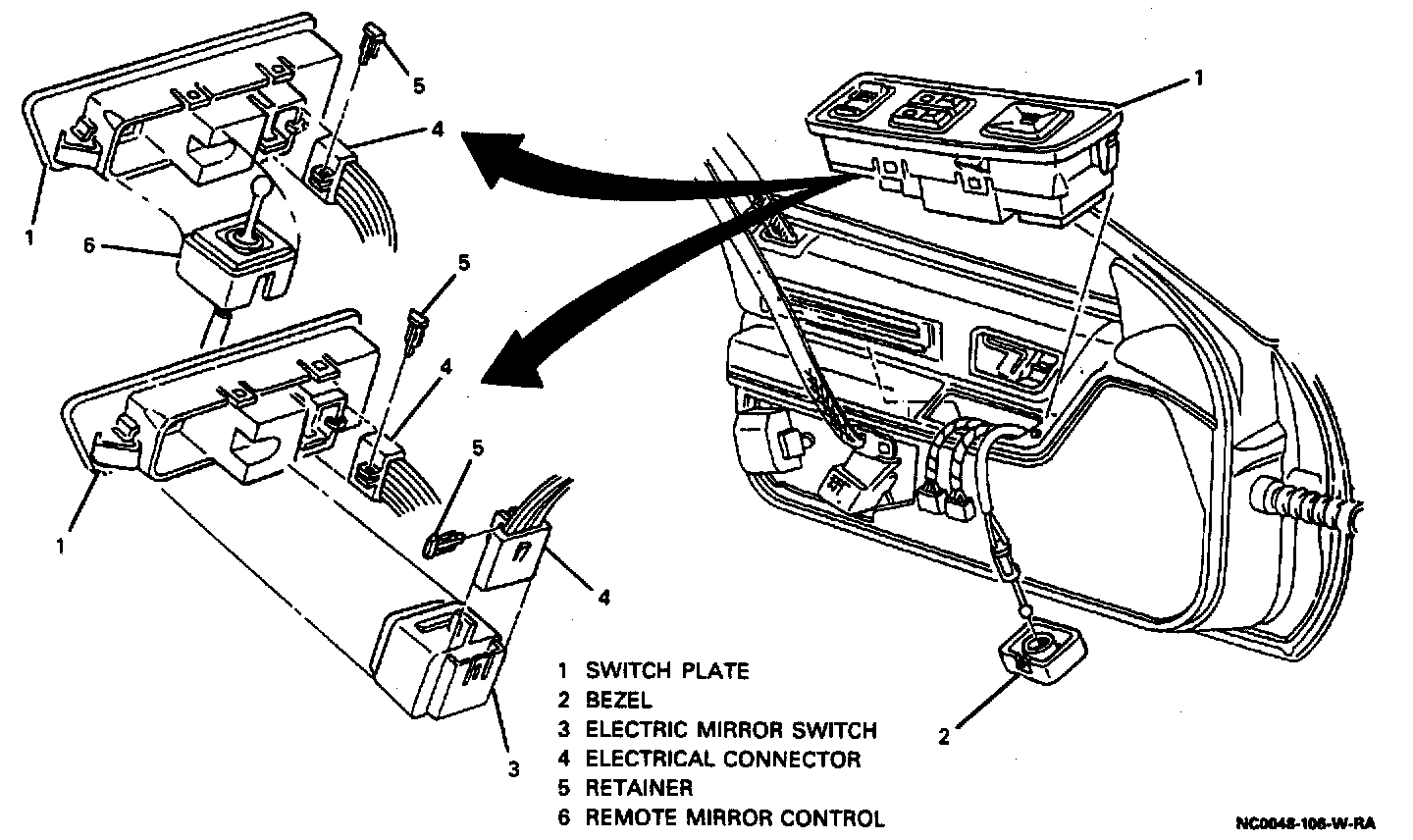 NOTICE: When removing a door trim panel or switch plate, the ignition switch must be in the OFF position. This will eliminate the possibility of shorting out the switch if a screwdriver, awl or metal object is used to remove the switch from the harness.