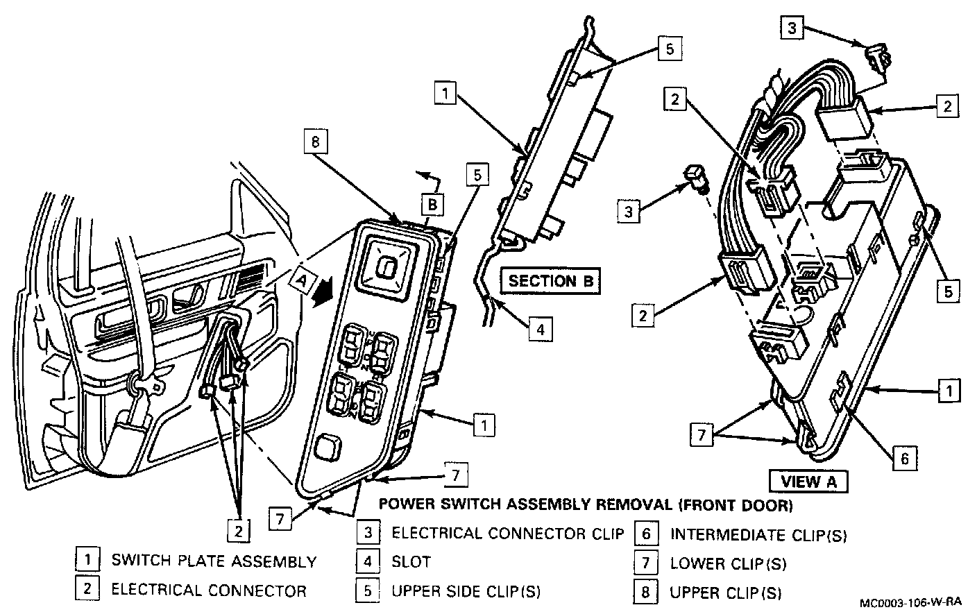 NOTICE: When removing a door trim panel or switch plate, the ignition switch must be in the OFF position. This will eliminate the possibility of shorting out the switch if a screwdriver, awl or metal object is used to remove the switch from the harness.