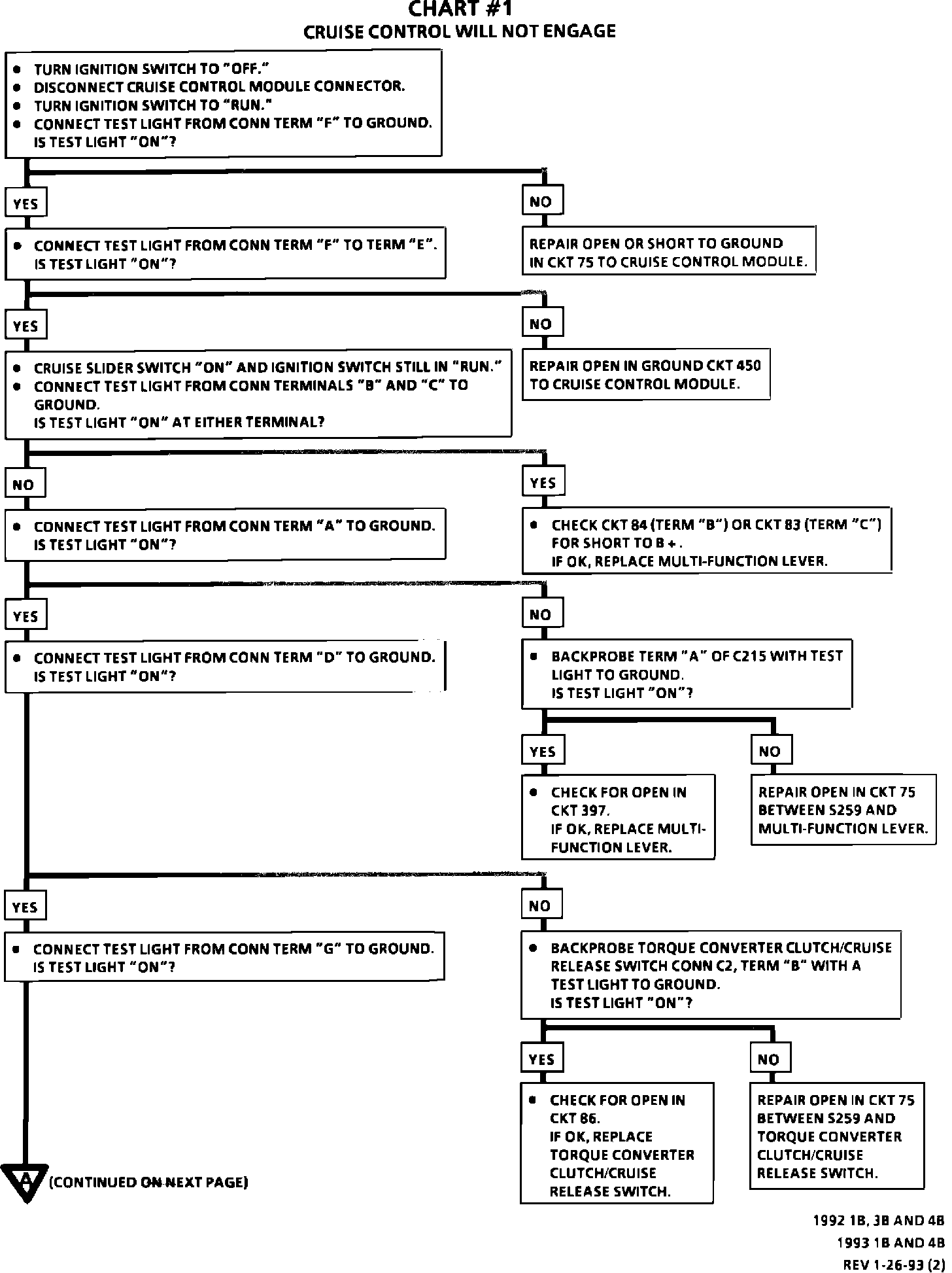This bulletin updates Service Manual Section 8A-34 "Chart # 1, Cruise Control Will Not Engage."
