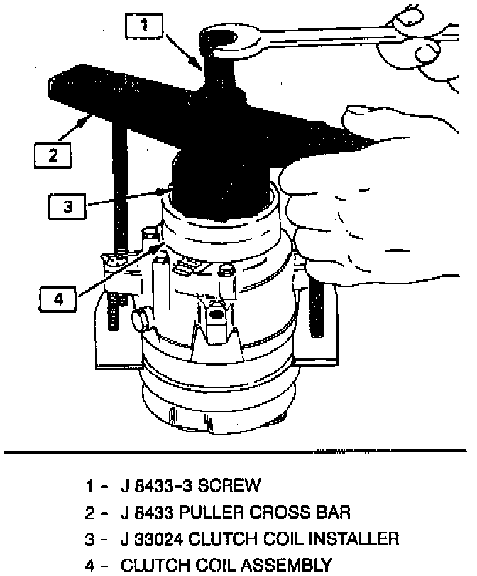 4. Turn the center forcing screw of the J 8433-1 puller crossbar to force the clutch coil onto the front head. Be sure clutch coil and J 33024 installer stay "in-line" during installation.