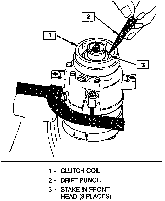 5. When coil is fully seated on the front head, use a 1/8" diameter drift punch and stake the front head at three (3) places 120° apart, to ensure clutch coil remaining in position.
