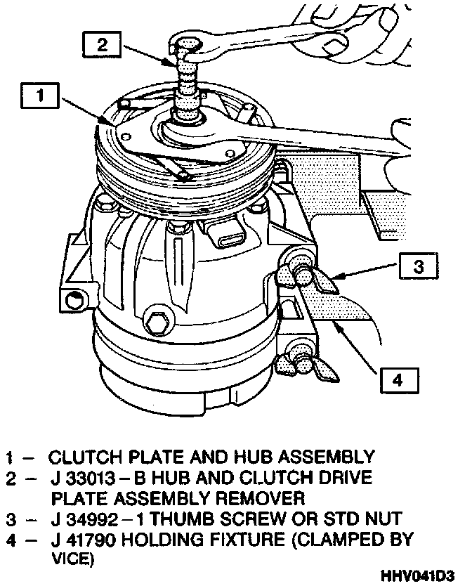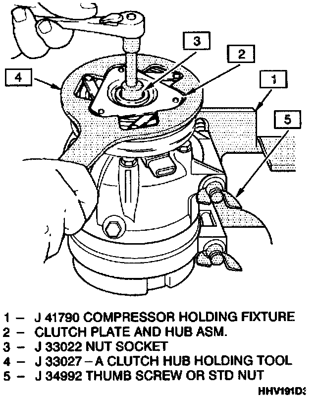 1. Clamp the holding fixture J 41790 in a vise and attach compressor to holding fixture with nuts and bolts (2).