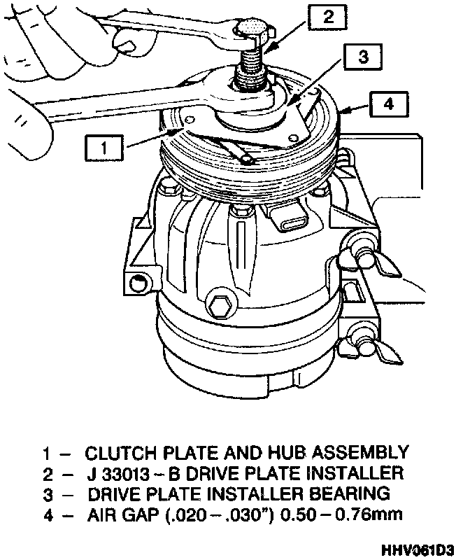6. Hold the center screw with a wrench. Tighten the hex portion of the installer J 33013-B body to press the hub onto the shaft. Tighten the body several turns, remove the installer and check to see that the shaft key is still in place in the keyway before installing the clutch plate and hub assembly to its final position. The air gap between frictional surfaces of the clutch plate and clutch rotor should be 0.40-0.50mm (0.015-0.020").