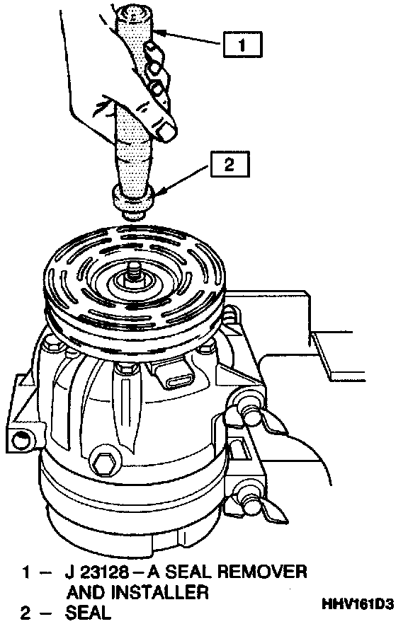 6. Fully engage the knurled tangs of seal remover-installer J 23128-A into the recessed portion of the seal by turning the handle clockwise. Remove the seal from the compressor with a rotary-pulling motion. Discard the seal. The handle should be hand-tightened securely. Do not use a wrench or pliers.