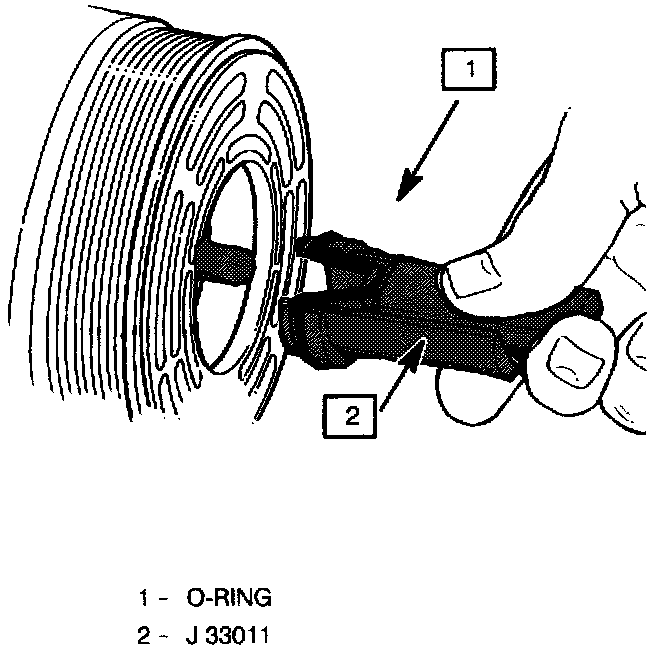 2. Insert the O-ring installer J 33011 into the compressor neck until the installer "bottoms." Lower the moveable slide of the O-ring installer to release the O-ring into the seal O-ring lower groove. (The compressor neck top groove is for the shaft seal retainer ring.) Rotate the installer to seat the O-ring and remove the installer.