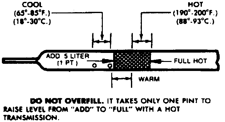 The transaxle oil level should be approximately 1/2 inch above the "FULL" mark at standing temperature (65°-85°F), or between the two dimples on the dipstick. The oil level at normal vehicle operating temperature (190°-200°F) should be between the "ADD" and" FULL" marks. Vehicle must be driven a minimum of 15 minutes to allow transaxle oil to reach normal operating temperature. To bring oil level from ADD mark to FULL mark requires approximately one pint of fluid. Check oil level with vehicle on level surface, parking brake applied, engine idling at operating temperature and transaxle in Park.