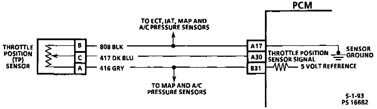 The TPS has three internal circuits. One to ground, a second from the PCM as a 5.0 volt reference source and a third circuit is used by the PCM to measure the output voltage. As the throttle angle changes (pressing down on accelerator pedal) the TPS voltage output varies from about .5 volt at idle to about 4.9 volts at wide open throttle (WOT).