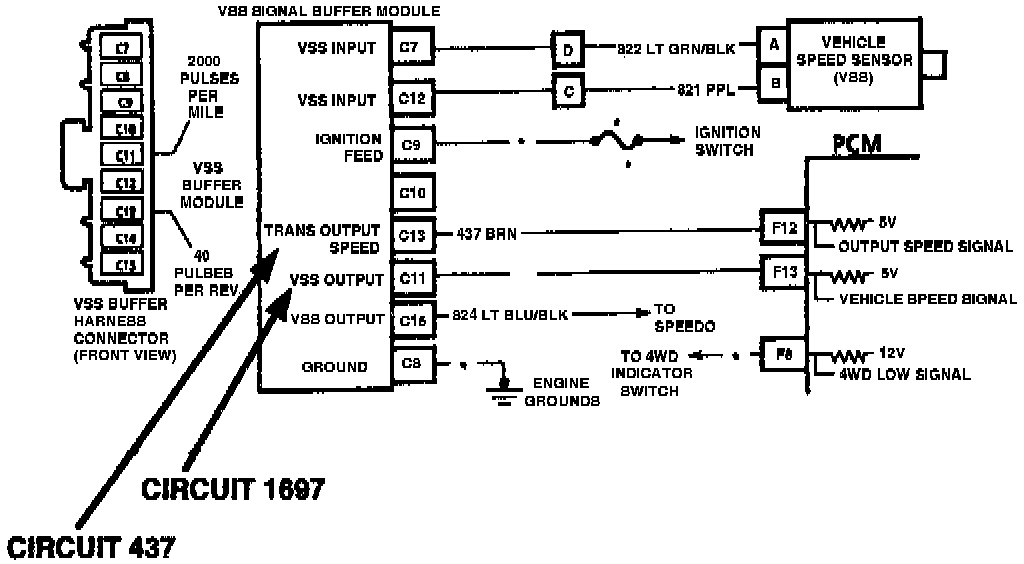 To perform these functions, the buffer is given a five volt signal from the vehicle's PCM on two circuits, 437 and 1697. Circuit 437 is used by the transmission shift points. Circuit 1697 is used by the PCM to determine road speed for uses such as vehicle overspeed fuel cutoff and idle air control valve position (figure one).