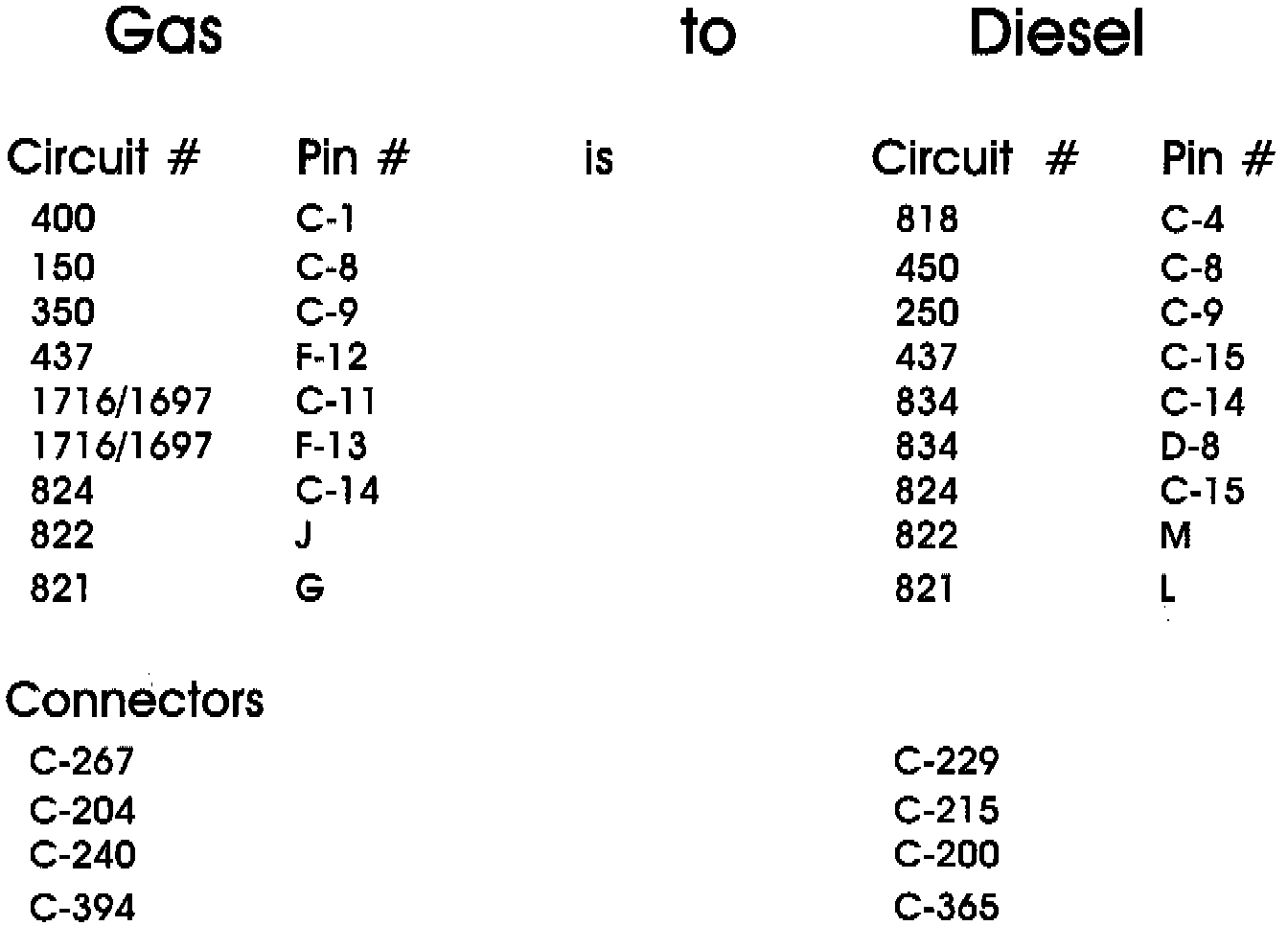 Diesel to Gas "Pin" Conversion Chart