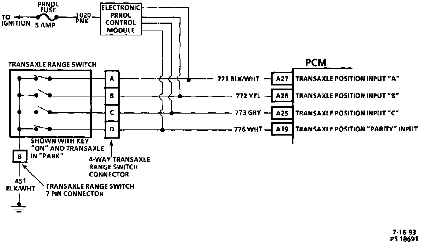 The gear select switch actually contains four switches. The PCM detects the desired gear range by monitoring which combination of switches is "ON" or "OFF" (see illustration.)
