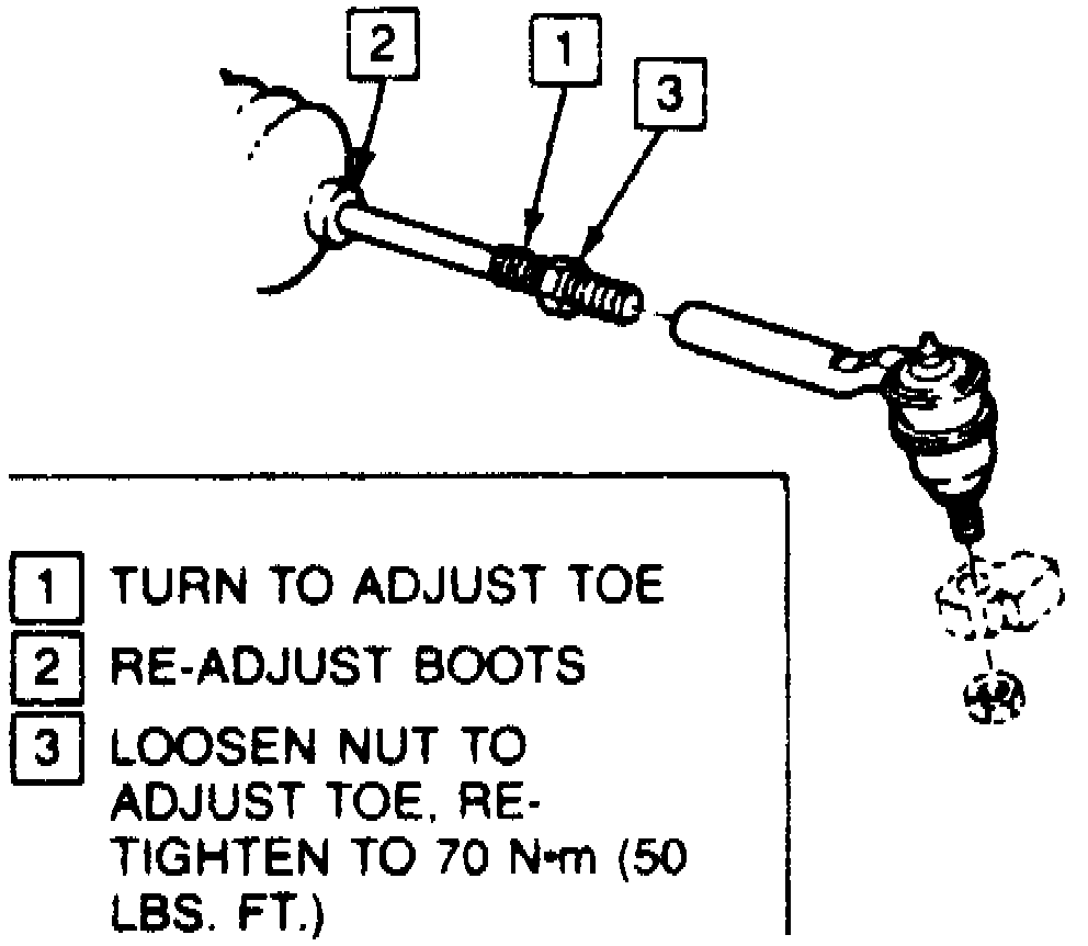 Adjust toe to specifications by rotating inner tie rod.