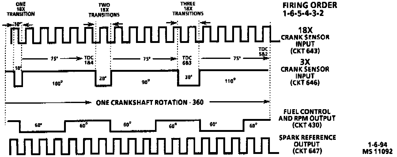 The fuel control signal sent to the PCM by the electronic ignition module is an "ON-OFF" pulse occurring 3 times per crankshaft revolution. This is neither the 3X nor the 18X crank sensor pulse, but both of these are required before the electronic ignition module will generate the fuel control signal.