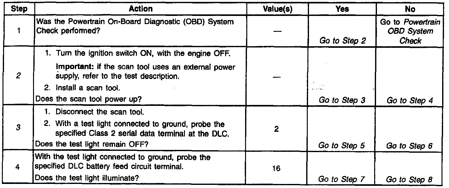 2. If the scan tool requires an external power supply, check the external supply for proper voltage and ground as well as the voltage and ground supplies in the DLC.