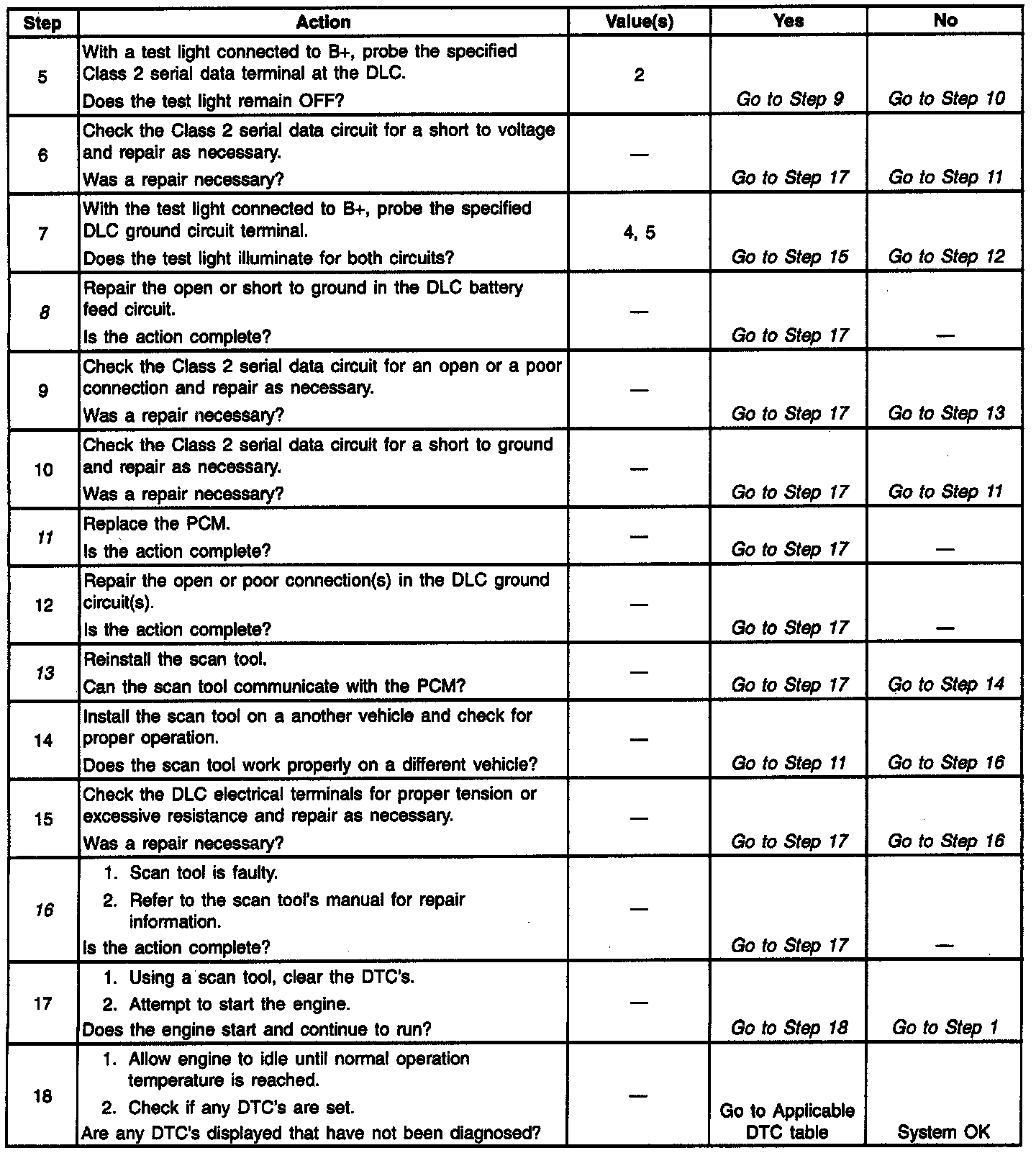 13. Refer to Diagnostic Aids if the scan tool will not display scan data. If the scan tool can communicate with the PCM and you were sent here from the Powertrain OBD System Check table, return to that table and complete the diagnostics there.