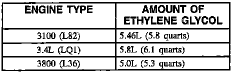 ^ If the coolant system has been flushed, first add 100 percent ethylene glycol in the amount listed in figure for the appropriate engine application. Then slowly add clean water to the system until the level of the coolant mixture has reached the base of the radiator neck.