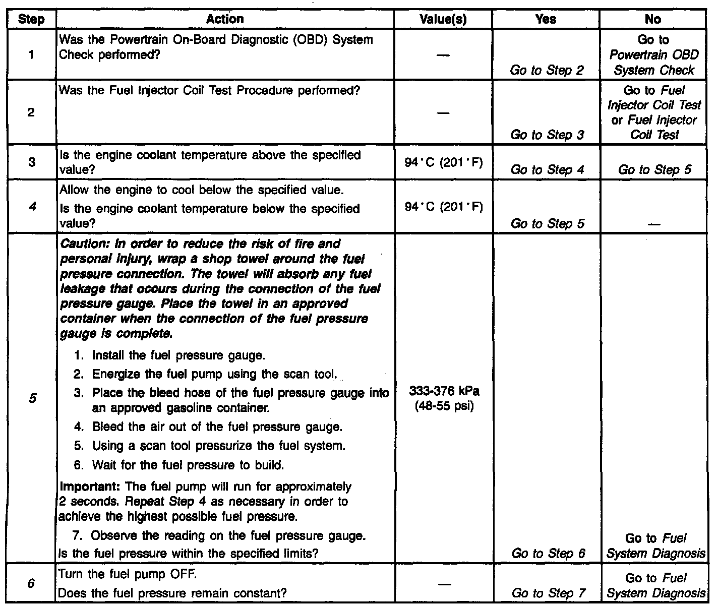 5. The fuel pressure should be within the specified range. If the fuel pressure is not within the specified range, refer to Fuel System Diagnosis