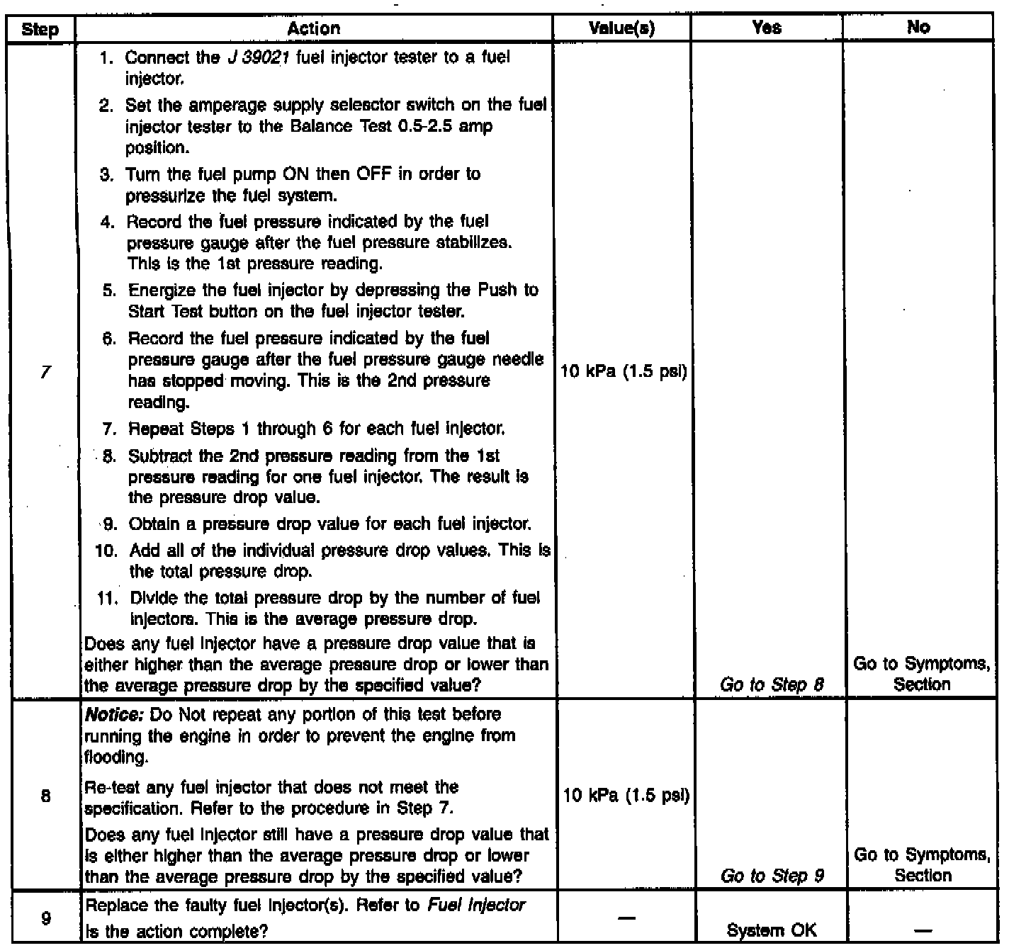 7. If the pressure drop value for each fuel injector is within 10 kPa (1.5 psi) of the average pressure drop value, the fuel injectors are flowing properly. Calculate the pressure drop value for each fuel injector by subtracting the second pressure reading from the first pressure reading. Refer to the illustration above.