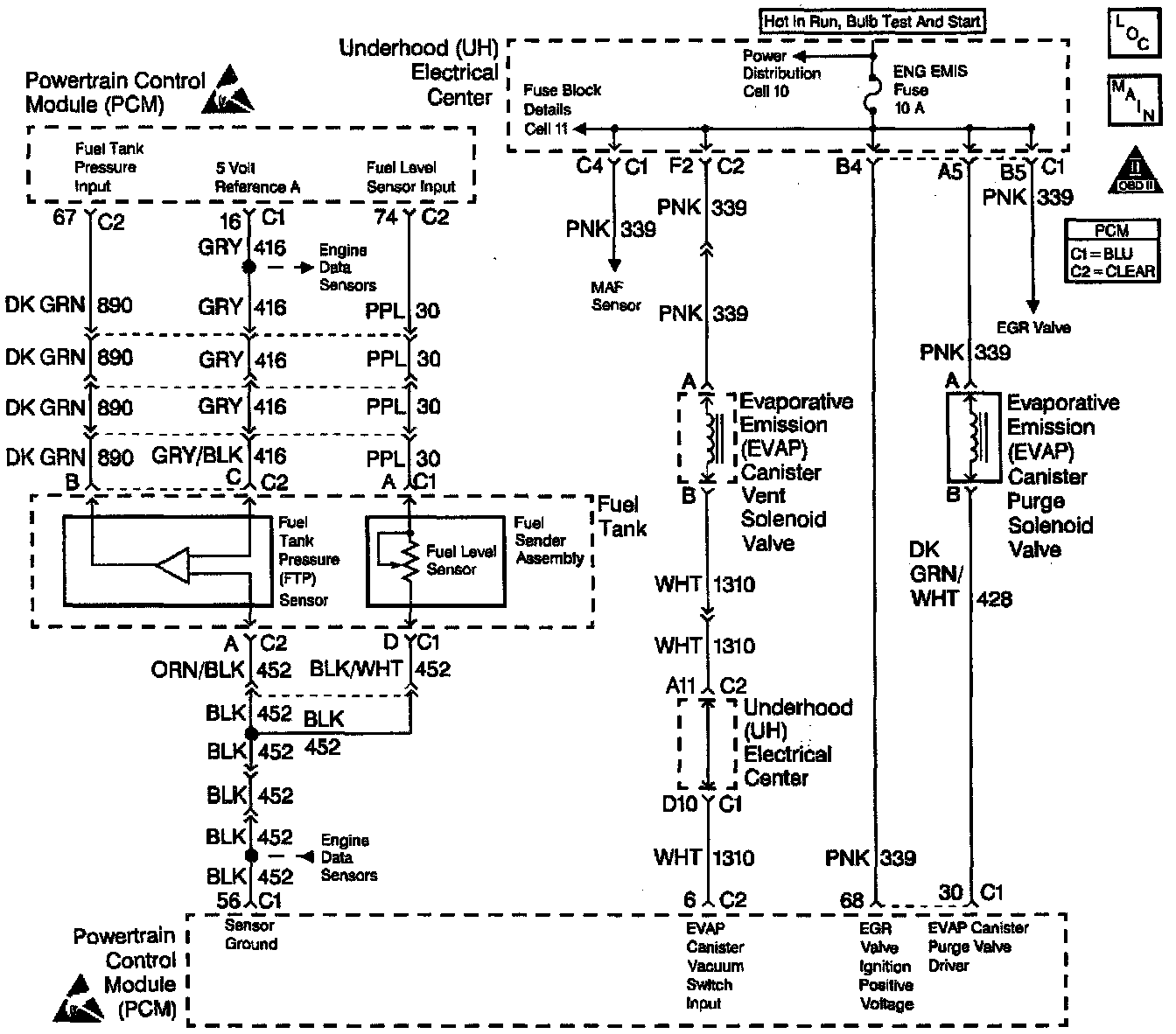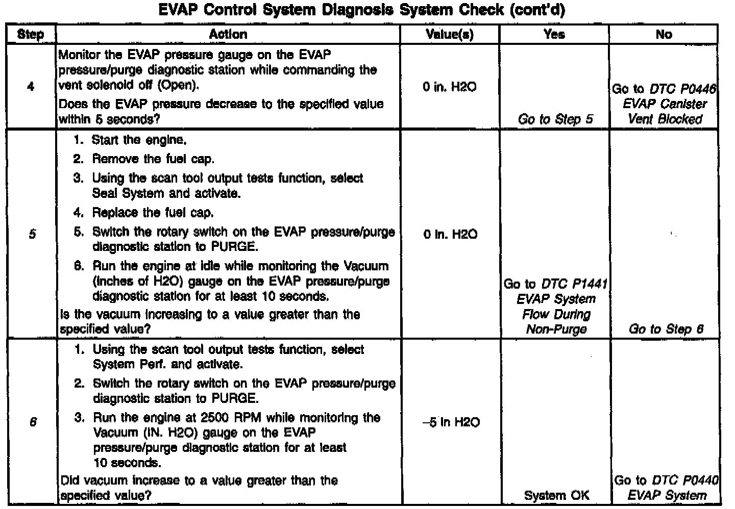 A stuck closed EVAP purge solenoid, stuck open EVAP vent solenoid, disconnected or damaged EVAP purge line or vent hose, leaking fuel cap, or till neck should set a DTC P0440 EVAP System. A small leak in the EVAP system should set a DTC P0442 EVAP Control System Small Leak Detected. An EVAP vent solenoid stuck closed, a restricted vent hose, or a blocked EVAP canister should set a DTC P0446 EVAP Canister Vent Blocked. A continuous purge condition with no purge commanded by the PCM (EVAP purge solenoid stuck open or leaking) should set a DTC P1441 EVAP System Flow During Non-Purge Refer to the DTC tables for further diagnostic procedures regarding the EVAP system.