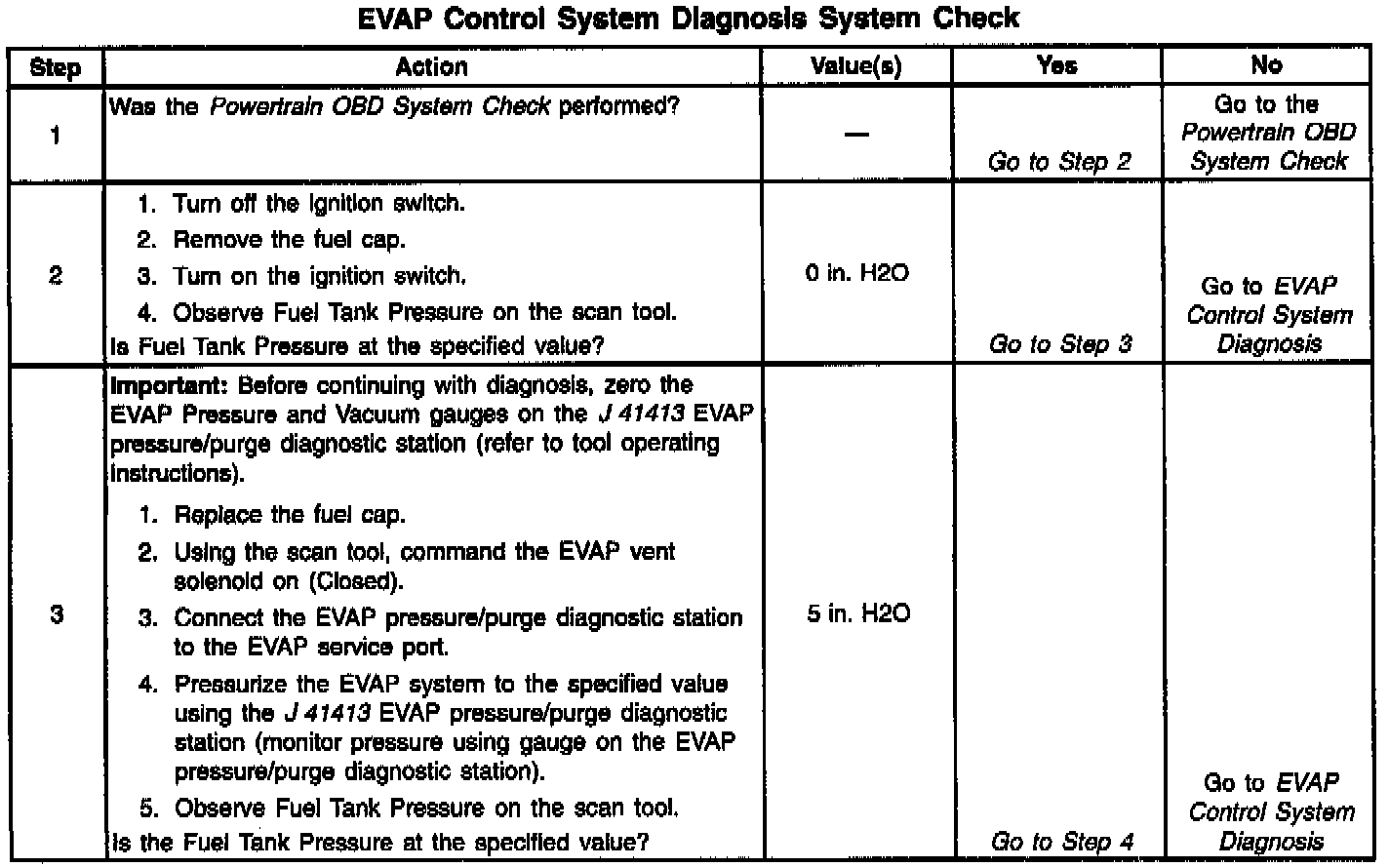 6. The PCM commands the EVAP purge solenoid off (open) and the vent solenoid off (closed) with the scan tool System Perf. EVAP output control function activated. Engine vacuum should cause fuel tank pressure to decrease when System Perf. is activated.