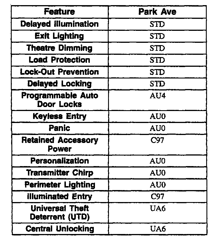 ^ Use the illustrated RPO chart and select the functions that are standard or optional for the particular vehicle being serviced. Failure to program the RFA module properly will cause the system to malfunction causing misdiagnosis and customer complaints.