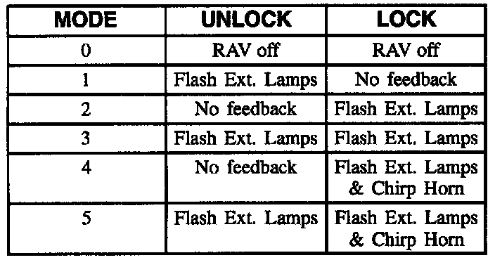 The Keyless Entry system provides feedback (Remote Activation Verification (RAV)) to the driver whenever the Keyless Entry Transmitter is used, RAV is customer programmable in six modes as shown in the following table.